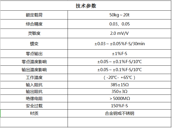 用途與特點(diǎn)具有良好的密封結(jié)構(gòu),通用性強(qiáng)。一端固定、一端加載,傳力形式多樣。適用于汽車衡、電子秤、料斗秤等??蛇x擇一體化標(biāo)準(zhǔn)信號輸出,三線制0~5VDC或4~20mA。