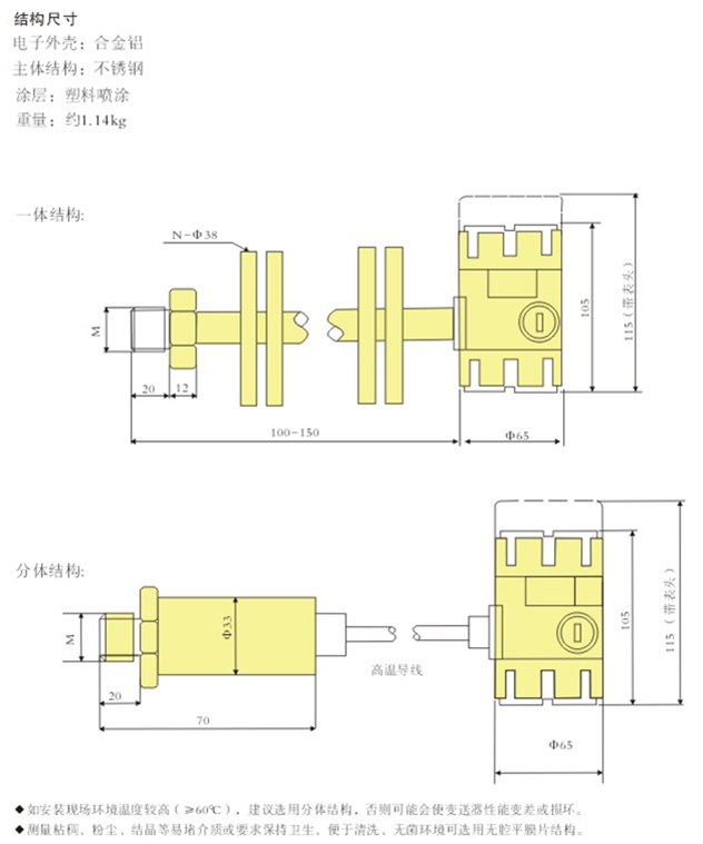 LY421型中高溫壓力變送器采用進(jìn)口耐高溫敏感元件組裝,傳感器探頭能在350℃高溫下長期穩(wěn)定工作。芯體與不銹鋼外殼之間采用激光冷焊工藝,使其完全熔為一體,確保了變送器在高溫狀態(tài)下的使用安全。傳感器的壓力芯片體與放大電器之間,用聚四氟乙烯墊片隔熱,并加有散熱裝置,內(nèi)部引線孔填充高效隔熱材料硅酸鋁,有效地防止了熱傳導(dǎo),保證放大轉(zhuǎn)換電路部分在允許溫度下工作。